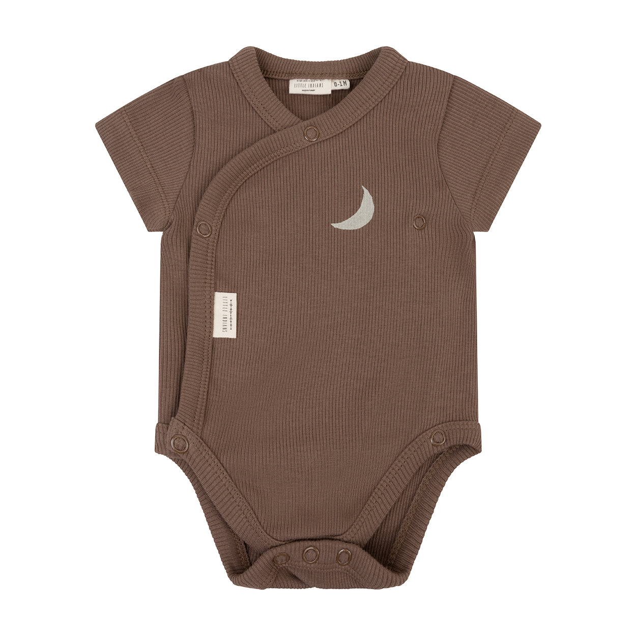 Een Newborn Overslag romper met korte mouwen in caribou met maan print van Little Indians gemaakt van Biologisch katoen. Een echte musthave voor je pasgeboren baby.